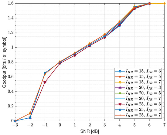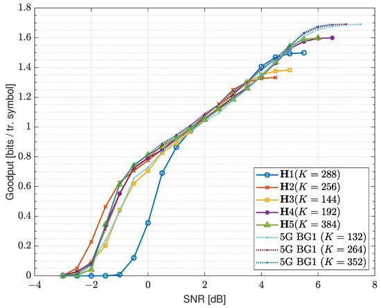 In Figure 9, we provide simulation results in the form of goodput performance, which is defined as the ratio of the number of information bits correctly delivered to the total number of QPSK symbols transmitted, required for successful decoding [11]. Obviously, the higher the SNR, the lower the number of average transmitted chunks needed, which means the goodput is higher. The upper limit of goodput for QPSK is , since if only the initial HR coded vector is transmitted, then information bits are successfully delivered per every QPSK symbol. The chunk size is assumed to be equal to P, because the encoding is performed in blocks of P bits.