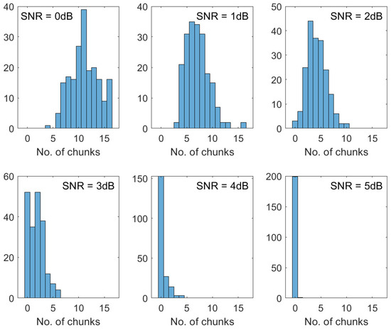 The designed QC-RL-LDPC codes successfully achieve the objective of the rate self-adaptability processing. As shown in Figure 10, the number of chunks required for error-free reception increases as the SNR decreases. The code should be selected for a specific use case, and the algorithm developed can design codes for diversified needs of information block length K, rates , and chunk sizes P.