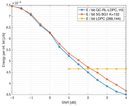 - In the regime just above 0 dB, the LDPC fixed-rate coding is more energy-efficient than QC-RL-LDPC coding. This is the regime for which an LDPC rate-0.5 code would be used under conditions that it was designed for; therefore, its advantage in this regime is as expected.