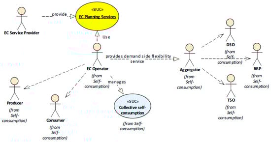 Moreover, there is a need to improve the energy efficiency of the building stock of the community and address environmental aspects related to potential new projects or regulatory compliance. The actors identified in this analysis are also shown in Figure 1. As presented, the new actors, prosumers and aggregators play an important role in achieving the EC’s objectives. The prosumer is an electricity consumer that uses electricity produced from his/her power plant [33]. Because of the need for more controllable generation and load on the demand side, demand-side flexibility is urgent and hence the requirements for optimisation of prosumers’ energy profiles on a building and EC level. The role of the aggregator is to interface with the Transmission System Operator (TSO), Distribution System Operators (DSOs) and Balance Responsible Parties (BRPs) [34].