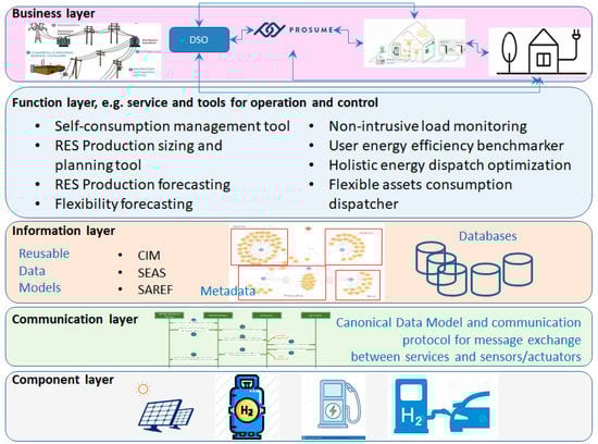 One of the most prevalent architectures for SGs and potentially very useful for ECs is the Smart Grid Architecture Model (SGAM). In 2012, the CEN-CENELEC-ETSI Smart Grid Coordination Group published the SGAM as a product of the standardisation of SG in order to fulfil the tasks laid down in the EU Mandate M/490 [48]. It especially considers interoperability and aggregate interoperability categories, resulting in five interoperability layers, as shown in Figure 2. The SGAM structure can be used to describe the entire operating environment of an EC, as it considers all the interoperability layers [49]. The most basic one, called the component layer, encompasses all the energy assets that can be integrated into an EC. Then, the communication layer manages the interaction between the assets of the component layer and the different services integrated into the EC ecosystem. These services, as well as the models and metadata necessary for their operation, are included in the information layer [50].