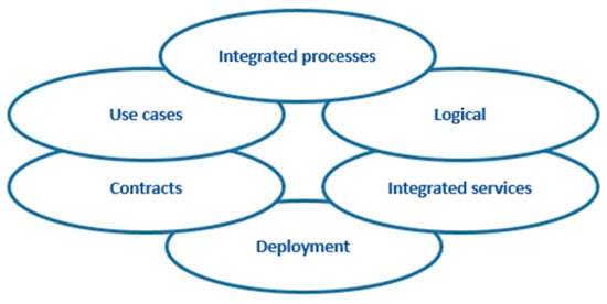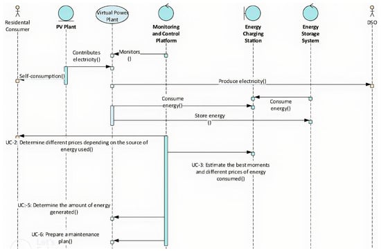 The architectural views model 1 + 5, shown in Figure 3, has been proposed for designing integration solutions of collaborating software systems [8]. The model enforces a high-level breakdown of the software system into Integrated processes, Use cases or Scenarios, Logical, Contracts, Integrated services and Deployment. Applying the model to the EC context, the integrated processes view refers to the management of the EC, while the use cases view explains the system functions that are important to its users, e.g., Figure 1 points to the EC Planning Services as a Business Use Case (BUC) and Self-Consumption as a System Use Case (SUC). Based on the logical elaboration of the functions, the integrated services view is dedicated to modelling the data exchange flows between system components or parties in the EC ecosystem d [51]. The integration of the monitoring and control platform with devices (energy charging station, energy storage system and the PV plant) used in the EU project NEON is given as an example in Figure 4.
