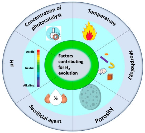 Many factors affect H2 evolution during photocatalysis, and they are discussed extensively with a focus on the development of effective photocatalysts. An illustration of the factors that contribute to H2 evolution is given in Figure 1.