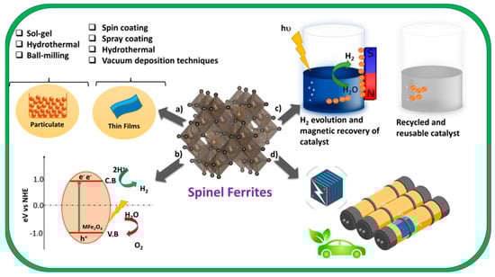 Figure 2. Showing (a) methods for the synthesis of particulate and thin films of ferrite nanomaterials (b) mechanism of H2 evolution (c) removal and recycling of ferrite photocatalysts (d) applications of H2 energy of vehicles and fuel cells.