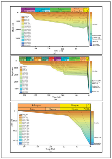 - Farid, A.; Khalid, P.; Ali, M.Y.; Iqbal, M.A.; Jadoon, K.Z. Seismic stratigraphy of the Mianwali and Bannu depressions, north-western Indus foreland basin. Int. J. Earth Sci. 2018, 107, 1557–1578. [Google Scholar] [CrossRef]