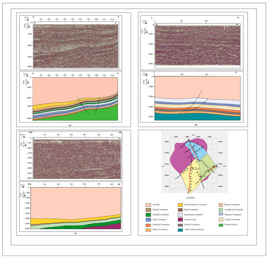 - Ahmed, N.; Ali, S.H.; Ahmad, M.; Khalid, P.; Ahmad, B.; Akram, M.S.; Farooq, S.; Din, Z.U. Subsurface Structural Investigation Based on Seismic Data of the North-Eastern Potwar Basin, Pakistan. Indian J. Geo-Mar. Sci. 2022, 49, 1258–1268. [Google Scholar]