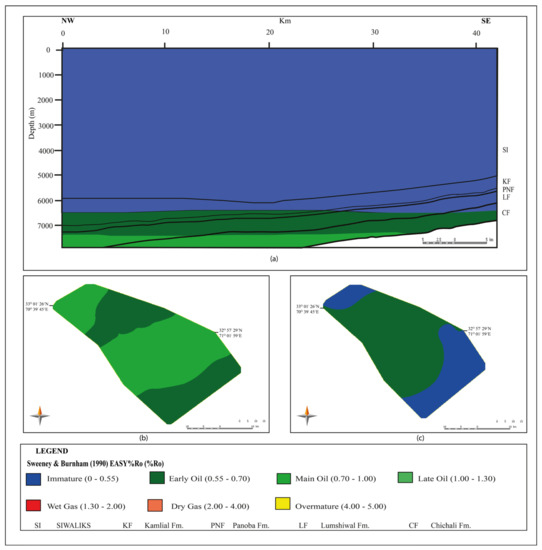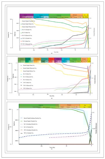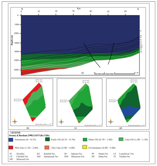 - The transformation ratio suggests that the Khisor Formation in the Southeastern and the Mianwali Formation in the Southeastern and Southwestern zones have been mostly transformed into hydrocarbons toward their deeper parts, whereas the kerogen in the Chichali Formation in the Southwestern and the Datta Formation in the Southeastern also partially transformed into hydrocarbons. In the northern zone, the transformation ratio is higher in the Chichali Formation when compared to Panoba Formation. Based on thermal maturity, it is assumed that all the source rocks have the potential to generate hydrocarbons.
