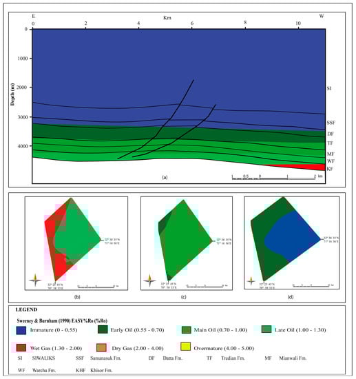 - Hadad, Y.T.; Hakimi, M.H.; Abdullah, W.H.; Makeen, Y.M. Thermal maturity history reconstruction and hydrocarbon generation/expulsion modeling of the syn-rift Rudeis and Kareem source rocks in the Red Sea Rift Basin, Sudan. Arab. J. Geosci. 2016, 9, 1–17. [Google Scholar] [CrossRef]