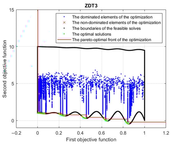 The test function’s specifics are provided in Ref. [10] as ZDT3. The space bounded by the design variables and constraints is shown in the picture with a black line. The green portion of the envelope curve for this field represents the ideal pareto front. The minimization of both objective functions is the optimization’s goal; this region is situated to the left of the field’s edge. As seen in the illustration above, a concave field could include several portions. An approximation of this optimal pareto front is obtained by performing a multi-objective optimization. The beginning of the pareto front approximation created as an outcome of the optimization procedure is shown by the red × sign. Since there is no better individual according to objective functions, they are referred to as non-dominated individuals. The blue dots represent the dominated individuals, since they are dominated by better individuals according to all objective functions.