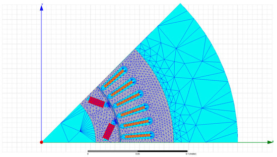 The two lower edges of the 2D model have periodic rotational symmetry, and the outer and inner edges have a zero-vector potential boundary condition. The material of the magnets is neodymium (NdFe35), the winding is copper and the stator and rotor are plated iron (M19_29G).