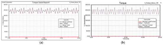 As the FEM model employs transient simulations, the calculated results were time-dependent; for this reason, it was feasible to compute quantities such as torque fluctuations during the post-processing step.