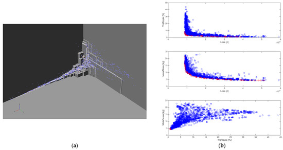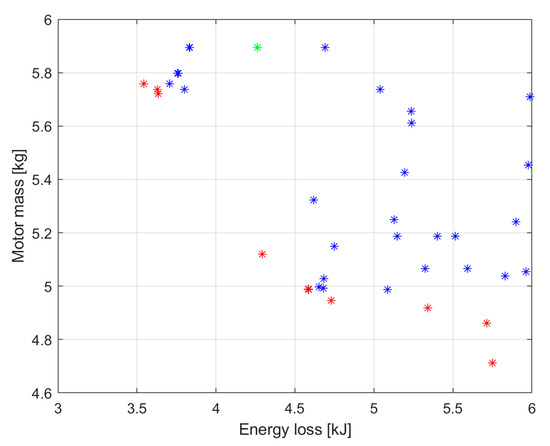 In Figure 14, the elements of the pareto front are marked in red, the non-dominated elements are marked in blue and the initial motor is marked in green. Although the optimization algorithm succeeded in creating a better motor in all aspects, this improvement was not significant, while at the same time, the lower mass motors produced disproportionately higher energy loss at the tested operating points. Figure 15 shows a zoomed-in image of the detail framed in Figure 14.