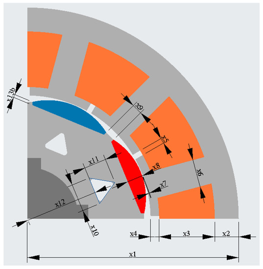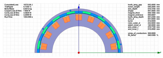 A total of 13 design variables were defined. Of these, 11 were geometric variables (slot dimensions, magnet dimensions, air gap dimensions, motor length and diameters). The remaining two were the number of turns and the wire diameter. Of these, one output quantity was the number of parallel threads. Each design variable also had upper limits. The installation location provided the maximum values for the geometric variables of the enclosure dimensions. To ensure that the geometric constraints only affected a relatively small portion of the feasible parameter space, the upper limits of the other geometric variables were set accordingly. The lower limits of the geometric variables were determined based on considerations of constructability. For the number of turns and wire diameter, wider limits were set. Although this wider range of design variables slowed down the convergence of the optimization algorithm, it allowed the optimization algorithm to search in a larger parameter space. The parameter values for the initial iteration were randomly assigned. The two operating points tested were 270 rpm–8, Nm–800 s and 270 rpm–0 Nm–200 s.