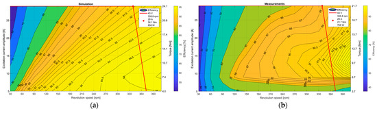 The material properties of the finished motor differ minimally from those in the simulation model, but they do not cause significant differences. The measurements were made in the electric powertrain testbench laboratory of the Széchényi István University. During the test, the input and output power of the motor were measured. The efficiency field calculated from the measurement results was suitable for comparison with simulation results if the motor controller and the mechanical losses were known. These losses were estimated to be between 3% and 5% based on previous measurements. The efficiency map of the simulated motor (a) and measured motor (b) can be seen in Figure 9.