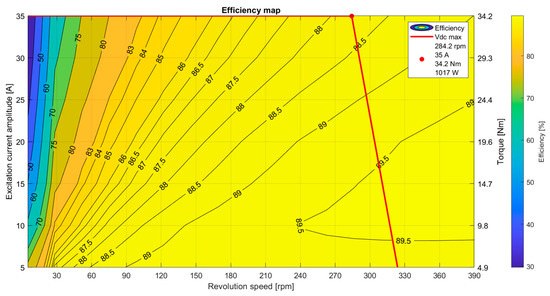 The efficiency map acquired from the simulation FEM model is shown in Figure 12. The limits of the efficiency map were determined by the DC voltage of the motor controller and the battery pack.