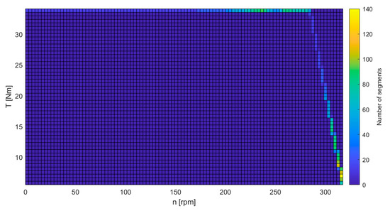 As the motor does not operate in the field-weakened range during the race, this range was not evaluated. The investigated driving strategy was optimized for TT-circuit Assen, which hosted the 2022 SEM competition. During the optimization, the 342 s lap was broken down into 0.01 s segments. In the duty cycle diagram, the colors indicate the number of 0.01 s segments where the drive was used at a given operating point. Since the drive is equipped with a free-wheel drive and no regenerative braking is applied, the free-wheel and braking operating points were not included here, so only 5110 segments of the duty cycle were considered. The driving strategy was optimized with the Max TRQ method, which is searching for places to apply torque and always applying the physically available maximum torque. The colors indicate how many of these 5110 segments were present at a given working point. The duty cycle associated with the impact system is shown in Figure 13.