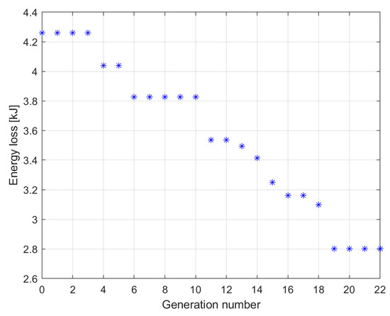 The results mentioned above demonstrate that a single-objective optimization that only focuses on loss energy can produce a better result in terms of loss energy. Because of the limitations imposed by the enclosure size, the mass cannot be larger than the initial mass of the SZEVOL. A total of 486 motor designs were considered in the single-objective optimization, of which only 273 required full FEM simulation due to the kriging surrogate model. In this case, the kriging was able to replace 43% of the evaluations. Figure 16 shows the motor with the lowest power loss per generation.