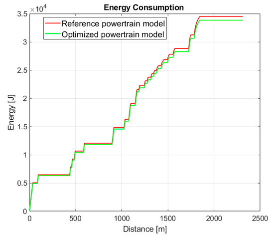 Powertrain models were created for the simulation model based on the FEM simulation results; these powertrain models represent the physical properties of the investigated drives. Two separate simulation cases were made, where the energy consumption levels of the drives implemented in the race vehicle were studied. The optimized powertrain could provide improvement compared to the reference result, reducing the energy consumption in one lap from 34.500 J to 33.830 J, which was an improvement of approximately 2%. The energy consumption curve of the investigated motors is shown in Figure 20. The motor optimization framework used discrete operating points to determine the objective of the optimization, although they were time weighted, but the real consumption savings could be properly investigated in complete vehicle simulations.