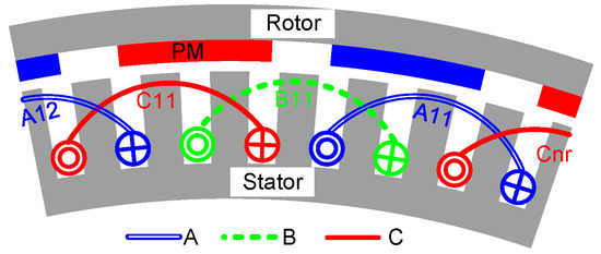 It is often convenient to use an analytical approach to calculate inductances at an initial design stage when the winding configuration of the studied machine is not complex. Unlike the large-power synchronous machines in [20], large-power SPM wind generators often have a simple winding configuration. In this paper, the distributed single-layer winding with a slot/pole/phase (SPP) equal to 1 has been used for the fault modelling, as shown in Figure 2.