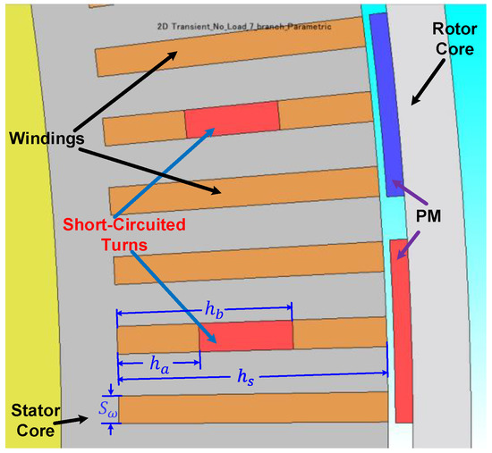 In Figure 3, the fault locations and related to the number of short-circuited turns (marked in red) are highlighted. The coil with short-circuited turns shown in Figure 1 is divided into three FEM coils with different numbers of turns. The A1_hc FEM coil represents the remaining healthy coils of the A1 branch. With regard to A11_hb and A11_ht FEM coils, they are the remaining healthy turns at the bottom and top of the two affected slots with short-circuited turns. The last FEM coil A11_fm in A1 branch represents the short-circuited turns in the middle of the two affected slots. In addition, one FEM coil in every other healthy branch of the three-phase windings is used to indicate it has healthy coils connected in series.