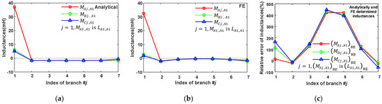 Characteristics of inductances between No. A1 branch and other branches for the 500 kW SPM machine. (a) Analytical results, (b) FE results and (c) Relative errors between analytical and FE results.