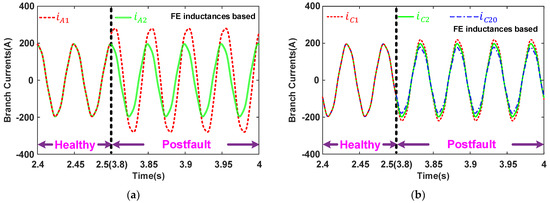 where , and . “” and “” represent two different phases amongst A, B, and C. It is worth noting that no matter what kind of inductances (FE linear or nonlinear) are used in the fault model, will all have diagonal forms because they are circulant and symmetric, and will all have block diagonal forms, the elements of which are shown in Appendix B. In other words, after the transformation, the fault model is greatly simplified because the number of the first-order derivatives of state variables in every transformed circuit branch voltage equation represented by a first-order differential equation is reduced from to 3 or 5. In addition, has to be represented by ], indicating that the transformed branch currents are used as new state variables.