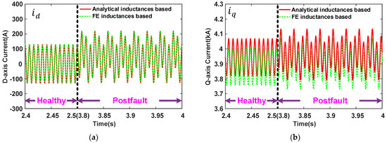 Unsurprisingly, as the 3 MW SPM machine has a large number of parallel branches and in each parallel branch, it has numerous series coils, the three-phase currents only change slightly before and after the one-coil short-circuit fault. However, lower order harmonics can still be observed in the d- and q-axis currents, as shown in Figure 7, and they can be used as a fault indicator for the fault detection purpose, as investigated in [31,32].
