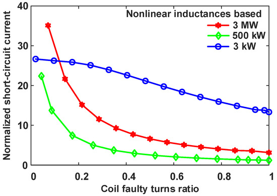 Normalized short-circuit current vs coil faulty turns ratio for different power-rating SPM machines using nonlinear inductances.