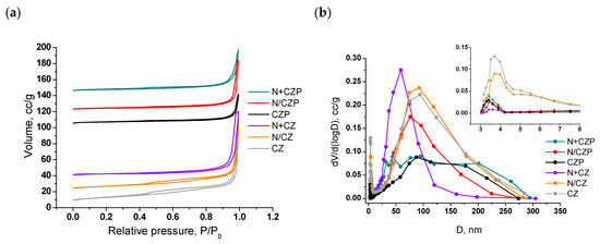 As can be seen, the samples obtained did not have a very high specific surface area; the values of SSA for the entire series of samples were about 10–30 m2/g, despite the fact that the nitrogen adsorption–desorption isotherms (Figure 1a) for all samples corresponding to the IV type were characteristic for mesoporous materials [60,61]. The introduction of praseodymium reduced the specific surface area of the initial support from 29 m2/g for CZ to 14 m2/g for CZP. This correlates well with data on the pore’s size distribution for supports (Figure 1b), where the number of mesopores less than 5 nm for praseodymium-doped sample was significantly reduced. In contrast, for samples prepared by the one-pot method (N+CZ and N+CZP), there was no difference in the SSA values. The pore volume was also reduced with the introduction of praseodymium from 0.126–0.150 cm3/g for undoped samples to 0.055–0.095 cm3/g for samples with Pr. The micropore (D ≤ 2 nm) volume was negligible for all samples and did not exceed 0.003 cm3/g.