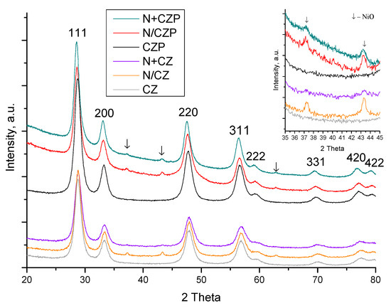 According to XRD data (Figure 2), for the entire series, the main intense peaks located at 2θ = 28.7, 47.7, 56.6, 59.4, 69.8, 77.0, and 79.4° corresponded to 111, 200, 220, 311, 222, 331, 420, and 422 reflections of the fluorite structure Fm3m (PDF 81–0792). There were no reflections of Zr and Pr individual oxides for the entire series. For the Pr-containing samples, the absence of double peaks and the shift in the fluorite peaks to the lower angles’ region (Figure 2, Table 1) suggest that praseodymium was embedded in the CZ cubic structure, which is consistent with data in the literature [25,62]. The ability of praseodymium to replace cerium without destroying the fluorite structure was ensured by the close radii of cations of the same valencies (Ce4+ = 1.110 Å; Pr4+ = 1.100 Å; Ce3+ = 1.283 Å; Pr3+ = 1.266 Å), and a slightly higher Pr4+/Pr3+ redox potential led to the formation of a structure with more active oxygen compared to undoped ones [62,63]. For N/CZ, N/CZP, and N+CZP, small peaks located at 2θ = 37.47, 43.36, and 62.83° corresponding to 111, 200, and 220 reflections of NiO (PDF 471049) were detected. It is worth mentioning that for N+CZ, a slight increase in the background was observed in the positions of 111 and 200 reflections of NiO, indicating the presence of highly dispersed particles of nickel oxide. The crystallite size of NiO (the average size of a coherent scattering region (CSR)) was estimated using the Scherrer equation for 200 peak analysis. The CSR values of NiO for N/CZP, N/CZ, and N+CZP were 23, 27, and 10 nm, respectively. Hence, one-pot synthesis provided smaller crystallites of NiO than the impregnation route.