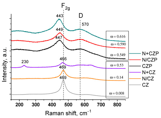 Raman spectroscopy was used to investigate vibrations in the oxygen lattice and crystalline symmetry in addition to XRD analysis, since this method is more sensitive to the microstructure of materials. Figure 3 presents the Raman spectra of the investigated samples. The main fluorite structure band in pure ceria was located at 464 cm−1 and corresponded to the F2g active mode that appears due to the symmetric stretching vibration of O anions around each Ce4+ cation [40]. This band was very sensitive to any changes in oxygen sublattice; therefore, with a change in the chemical composition or defect’s concentration, the band shifted to lower or higher energies. For our samples, the incorporation of smaller Zr4+ cation led to the F2g band being shifted to higher wave numbers, while the incorporation of close-size praseodymium shifted it to lower wave numbers, which is in good agreement with data in the literature and also confirms the incorporation of doped cations in the fluorite lattice [40,62]. Such a strong shift in the case of Pr cation was probably connected with the increased structure distortion [62].