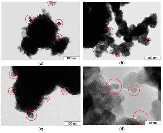 TEM: (a,c) impregnated Ni/CZP; (b,d) one-pot N+CZP. NiO nanoparticles are marked by red circles.