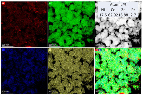 The images of HAADF-STEM with EDX analysis show the distribution of elements in the particles of the one-pot N+CZP catalyst (Figure 5). As in our previous works [58], the synthesis of one-pot catalysts under supercritical conditions allowed us to obtain a homogeneous distribution of cations. Ce, Zr, and Pr cations of the support, as well as Ni cations, were uniformly distributed in the structure of Ni+Ce0.75Zr0.15Pr0.1O2.
