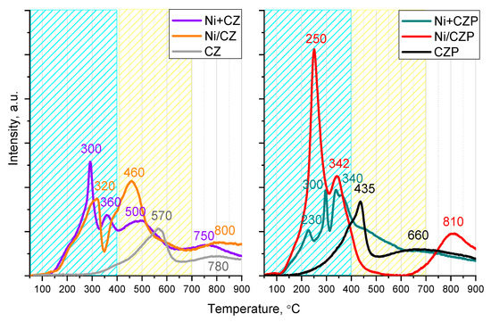 The curves of two supports (CZ and CZP) represent two standard reduction regions for these oxides: the medium-temperature region at 300–600 °C, related to the reduction of more reactive surface oxygen, and the high-temperature region above 700 °C, corresponding to the reduction of bulk oxygen, limited by internal diffusion. It can be seen that for the Pr-doped support, both the start of reduction and the maximum of the first peak shifted by about 200 °C towards lower temperatures, which indicates the significant facilitation of the reduction of surface oxygen with doping.