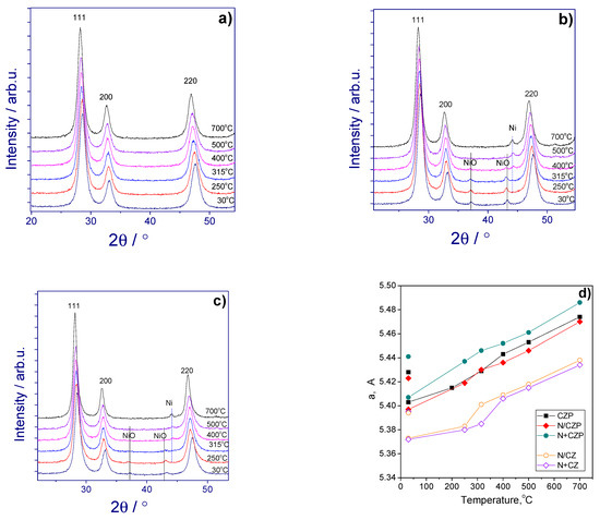 Diffraction patterns recorded during in situ reduction: (a) CZP; (b) N/CZP; (c) N+CZP. The reflections of the fluorite structure are labeled; the positions of NiO peaks are indicated by solid lines and those of Ni are indicated by dotted lines. (d) Fluorite lattice parameters versus temperature.