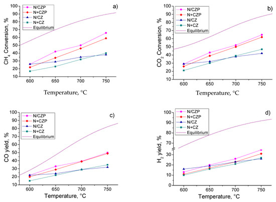 The results of MDR catalytic experiments are shown in Figure 8. Before testing, a blank experiment was carried out with an equivalent to the catalyst’s amount of quartz; no reactants were converted and no products were formed over the entire temperature range. A carbon balance calculated for all experiments was not lower than 95%. For all samples, an increase in the conversions of methane and carbon dioxide was observed with increasing temperature in accordance with the endothermicity of the reaction.