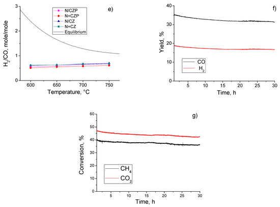Catalytic test results for the N/CZ(P) and N+CZ(P) catalysts in methane dry reforming catalysts: temperature dependences of (a) CH4 conversion (b) CO2 conversion; (c) CO yield, (d) H2 yield, (e) H2/CO; (f) H2 and CO yields; and (g) CH4 and CO2 conversions in long-term tests for N+CZP one-pot catalyst at 700 °C. Catalyst grain size 0.25–0.5 mm, contact time 10 ms, C0(CH4) = C0(CO2) = 15%.