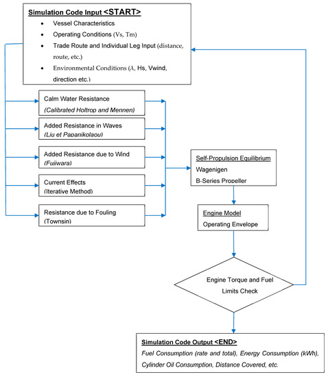 For each one of the voyage legs (given distance in nautical miles), the vessel’s particulars, ordered leg speed and calm water resistance curves are input, as well as the loading of the generators and the maneuvering time. If the leg includes a discharging, loading or bunkering port, the port stay in hours is also used. Based on this profile, the voyage-associated costs, together with the fuel costs, are calculated on a much more accurate and realistic basis. Each voyage is broken into distinct geographical legs for which a separate voyage profile is modelled and adjusted. The operating speed is calculated using the average leg speed and determining the probability of a +/−20% deviation resulting in a probabilistic ordered speed (speed over ground/SoG). As the input for each resistance calculation module is Speed Through Water (StW), the current calculation model is in turn activated. Current effects are captured using the iterative method of ISO 15016-2016 [24] on the ordered, SoG value. The correction to the operating speed is positive for the cases of astern current and negative for the cases of ahead current. All currents are considered for arbitrary directions, both in the ahead and astern term and trigonometrically split in an active current (longitudinal axis) and drift current (transverse axis) that only yields deviation rather than speed loss. The final resulting StW with current effects is then used as input in the next simulation sub-routines. From the above-mentioned two corrections, the probabilistic ship speed is derived and based on this the calm water resistance, delivered power and added resistance and power calculations take place. First, the Calm Water Resistance for the corrected Ordered Speed is calculated from Calm Water Resistance-developed curves (for ballast and laden conditions) in the corresponding module of the RHODA. The added resistance module is called from within the operational simulation module on a user-defined time-step (continuous model) with the final estimation calculated on a probabilistic and spectral basis for different wave directions, wave heights and wave lengths, resulting in a single figure for a developed seaway determined from the environmental model deployed. Depending on the months since the last dry dock (input variable), the increase in hull roughness and corresponding hull frictional resistance is calculated using the sub-routines of the corresponding RHODA module. After this assessment, a total resistance module for each time step in each voyage leg is calculated. For this given speed resistance value (kN) and considering the chosen (optimized) propeller characteristic curves (Kt, Kq), the propeller operating point per time stamp and leg is derived. A parallel check is also run with regard to the derived operating point of the propeller and its relevant position in the engine envelope in order to ensure that the (RPM, Power) point does not exceed the torque limits of the engine. In such a case, the RPMs are controlled with the same PI controller philosophy as in a modern two-stroke marine diesel engine governor with involuntary loss of speed as a result. The final determination of the operating point of the hull–propeller–main engine results in the final value of delivered power, as well as the resulting consumption and efficiency figures which are summed for the entire voyage as well as on annual and lifecycle bases. The above are summarized in Figure 2 below.