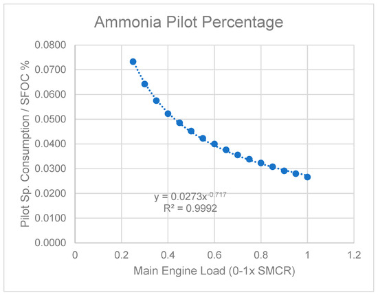 When taking into consideration the total energy balance onboard for seagoing conditions, it is straightforward that the main engine and the energy demand of the latter constitute the primary and major consumption components of any propulsion plant. For the herein presented study of the Zero Emission Vessel case study, a two-stroke engine-based propulsion plant is assumed, accompanied by four-stroke diesel engine generator sets. Effectively, the philosophy of the propulsion and engineering plant of the vessel is the use of the ammonia-fueled counterparts of the existing VLSFO-fueled components. One could argue that the use of solid oxide fuel cells could replace both propulsion and electricity generation components; however, due to the very high capital intensity of this technology, such applications were not examined. At the time of the code development and writing, there were no available two-stroke engines capable of burning ammonia in operation or as readily available designs. The only contemporary ammonia-powered engine that could be used as an analysis basis was the “ME-C-LGIA” developed by MAN [4]. The data available to the authors, however, were available only for the larger bore seven-cylinder G80 engine of MAN (800 mm bore), which is included in the methodology engine library and repository but not frequently selected by the engine–propeller matching module. Given that the same data for the same tuning are also available for the conventional, “base” engine of the G80 family (7G80ME-C10.5) and considering the thermodynamic process and the diesel cycle use of the LGIA engine [4], it was decided to define a load-dependent “scaling” function that can be used for all available engines in the RHODA engine library to convert the Specific Fuel Consumption figure (MGO basis) to Specific Ammonia Consumption (SAC). The scaling function has been modelled by deriving a logarithmic function using regression models (Figure 5), while the specific pilot consumption was defined again as a load-dependent non-dimensional function of the SAC (Figure 6). The pilot fuel is hereby assumed to be MGO or VLSFO, but in future analysis, it can be considered as biofuel instead.