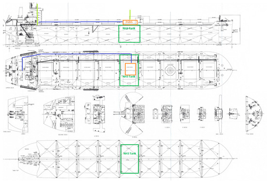 Sketch of the relevant locations of the NH3 tank (green), FGSS room (orange), NH3 lines (blue) and vent lines (light green).