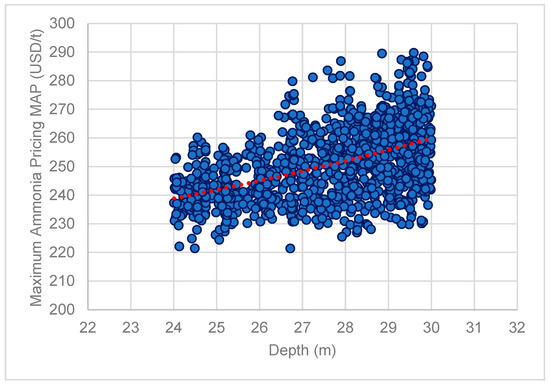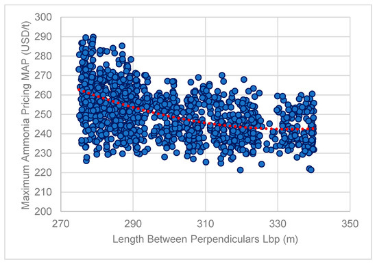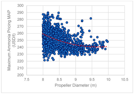 A second attempt to map the pricing of NH3 was made through the introduction of a new design metric, the Maximum Ammonia Pricing (MAP). This metric was conceived by one of the authors in the preliminary assessment of NH3-powered concepts of VLCCs joint industrial projects (JIP) and inspired by the definition of the Required Freight Rate design metric. In this context, the Maximum Ammonia Price reflects the maximum allowable pricing of NH3 that will allow an NH3-powered vessel to recover the additional CAPEX as well as OPEX (due to the threefold daily consumption) within 10 years from delivery of the NH3-powered vessel (or retrofit) considering the savings realized from the reduced CO2 taxation. This is depicted in the below formula: