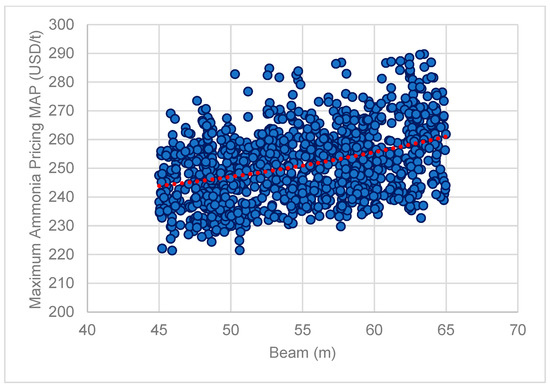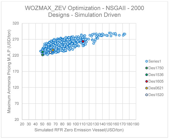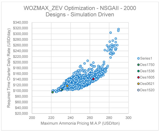 The Global Optimization Study conducted for the zero-emission vessel herein presented has been using the RHODA model in CAESES® software. The optimization engine selected was the NSGAII algorithm (Non-Sorting Genetic Algorithm II) used in previous research work [23]. The NSGAII setup based on previous experience was deployed for 20 generations of designs, with each generation containing a population of 100 designs. As a result, a total number of 1196 viable designs were generated out of a total population of 2000 designs corresponding to a 59.8% success rate. The reason for the use of a higher number (20 generations of a 100-item population size, corresponding to 2000 variants) is the positive effects of a higher number of generations in the Pareto front structure and density. The lower success rate was the result of the presence of primarily unfeasible designs (very low DWT or violations of the 1966 Loading Line Freeboard Height requirement), and not an outcome affected by the EEDI Phase 3 constraint with almost zero effect, since reduction in the EEDI was more than 80% due to the use of ammonia as a fuel. The RHODA model also included a second, vessel digital twin corresponding to the VLSFO powered counterpart of each design variant. In this way, the effect of the NH3 components on the design and optimization path as well as direct comparisons and assessments of ZEVs with theor VLSFO counterparts are feasible. Additionally, following the global optimization runs, a comprehensive sensitivity analysis with regard to the resulting Maximum Ammonia Pricing (MAP) was conducted with the following key findings: