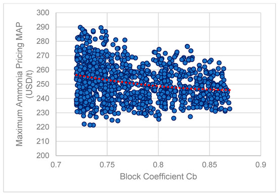 A very interesting finding for the observed values of the block coefficient of dominant variants is that all designs are pushed at the lowest boundary of the range of block coefficient at values in the range of 0.72–0.75, which is not common in actual shipbuilding practice. Interestingly, the reduction in the Cb for simulation-based studies, apart from reducing the installed power of the main engine, drastically reduces the added resistance in actual seaways and for the most frequent operating speeds of the specific trade routes examined.