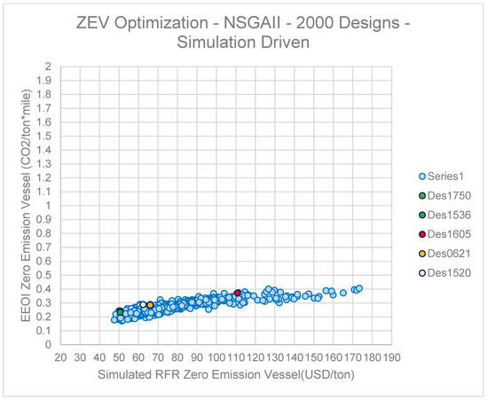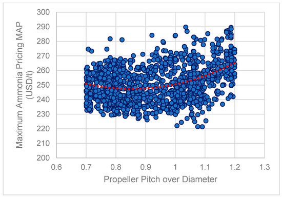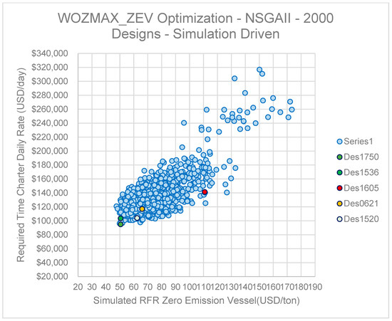 For ID1750, the total Net Present Value (NPV) of the Total Cost of Ownership (TCO) as derived from the lifecycle simulation is USD 527,808,087 and a simulation-based RFR of USD 50.554/ton. The VLSFO equivalent vessel of ID1750, in turn, has a TCO NPV of USD 191,652,427 and a simulation-based RFR of USD 16.75/ton (Table 8). The equivalent values for the baseline design are TCO NPV USD 647,468,102 and RFR USD 58.875/ton for the NH3-powered and TCO NPV USD 219,089,401 and RFR USD 18.31/ton for the VLSFO counterpart. Therefore, it can be deduced that while “navigating” on the Pareto frontier of the NH3-powered designs, a difference/increment of one USD/ton of RFR among dominant variants would translate to USD 14,380,485 of the discounted Total Cost of Ownership. Similarly, for a VLSFO-powered vessel, an RFR difference of one USD/ton among design candidates would correspond to USD 17,587,573 of the discounted Total Cost of Ownership.