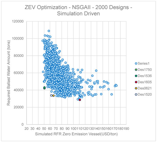In Figure 14, the drastic reduction of the EEOI value is clearly identified. For the VLSFO counterparts of the dominant variants, the best EEOI values attained where in the region of 1.8 to 2.0 tCO2/ton × mile, while for the Zero Emission Vessel cases examined here the equivalent range was between 0.2 and 0.4 tCO2/ton × mile, corresponding to a reduction in the range of 78–90%. Such a drastic reduction contributed to the absence of carbon in the molecule of ammonia (NH3), completely removing both the EEOI and the EEDI from affecting the design decisions and sensitivities. In Figure 15, the scatter diagram comparing the simulation-based RFR for the zero-emission vessel variants and the Required Ballast Water amount is depicted. An arc-shaped Pareto frontier is observed. At the bending point of the arc, there are some offset individual designs that strictly dominate the rest of the design cloud of all adjacent regions. The ranking and pattern indicated that left-hand side regions are characterized by low RFR (and low EEOI) variants that require bigger amounts of Ballast (due to bigger dimensions) while the right-hand side is comprised of vessel variants of higher RFR (and EEOI) and drastically reduced Ballast Water amount. The most interesting region is, as previously mentioned, the area where the Pareto arc is bent. The region on its left side is comprised of a very sharp increase in the Ballast Water amount with almost negligible improvement in terms of RFR. It is therefore not a surprise that all the dominant variants resulting from all utility function scenarios are situated in the said region.