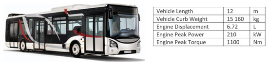 The chosen vehicle is a 12-m heavy-duty urban bus, powered by a 210 kW, 6-cylinder turbo-diesel engine. Its main characteristics are reported in Figure 1.