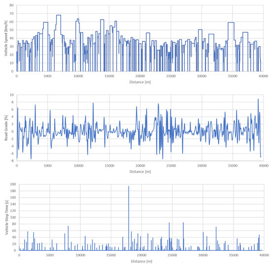 Mission speed target, road grade and vehicle stop times as a function of covered distance.