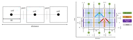 - A finite volume numerical solver for coarse meshes, to carry out a quick simulation: the fast simulation method (FSM). This is based on the “1D cell” method, which derives from the more general 3D cell method proposed in [23]. This finite volume method is based on the solution of the mass, energy and momentum conservation equations in time and is very conservative even with large mesh size, increasing the time step size and reducing the CPU/real time ratio. The method is explicit in time like the CG-TVD, while the main difference is that it is applied on a time-space staggered grid, evaluating quantities in the cell centers and fluxes in the ports, which are staggered by half time step and half mesh size [24]. Figure 7 shows the schematic of the numerical method.