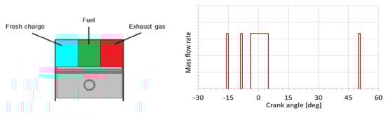 A brief description of the combustion model for the diesel engine is reported below. It has been developed [27] to handle current multi-pulse injection systems, ensuring fast run times. The 0D thermodynamic combustion model subdivides the chamber into three zones, as highlighted in Figure 8: fresh charge, fuel (vaporized) and burned gas, applying the first law of thermodynamics to evaluate the pressure and temperature variations.