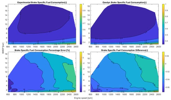 Figure 9 shows the contour plots of the measured and computed brake-specific fuel consumption (BSFC in g/kWh), with the relative and absolute errors on the whole steady engine map. The agreement with the measured data is satisfactory and the trend is well captured. This is the most important validation to achieve a predictive model, which can be used for the simulation of a driving cycle with good confidence about the total fuel consumption.
